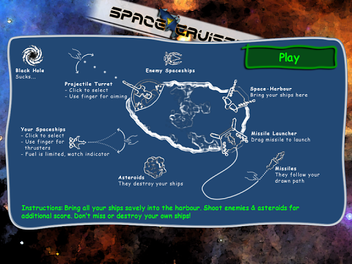 - Select a spaceship, and SHORTLY tip on the screen to enable thrusters. Fuel is limited, and spaceships MUST be brought to the harbor!