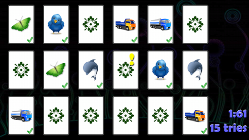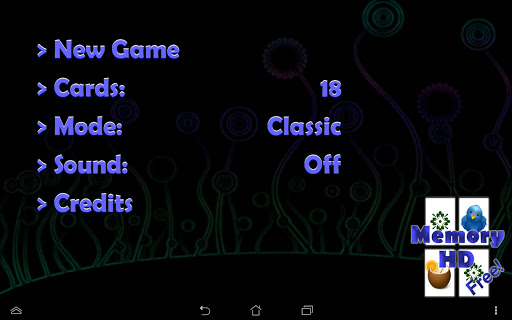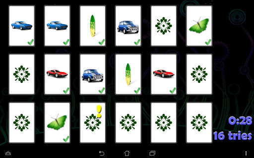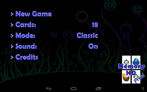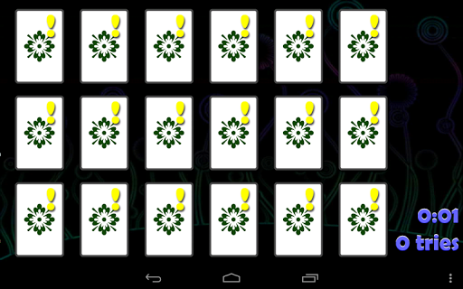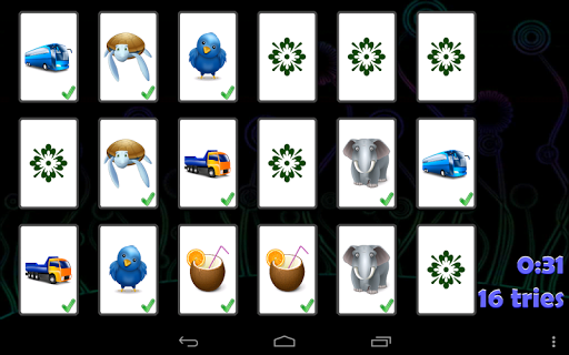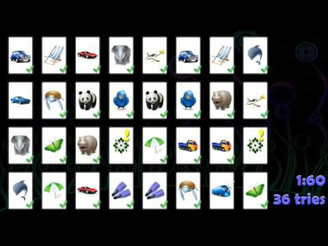 Memory is a simple and intuitive game. This app presents a clean and straightforward version of the classical, fun game in HD graphic, also for tablets. Find pairs of cards showing the same image by turning two at a time. You can play with 4, 6, 12 or 18 cards on mobile phones or with 6, 12, 18, 20, 24, 28 or 32 cards on tablets. With the flash mode you can further train your memory by getting a peak on the cards before they are hidden.