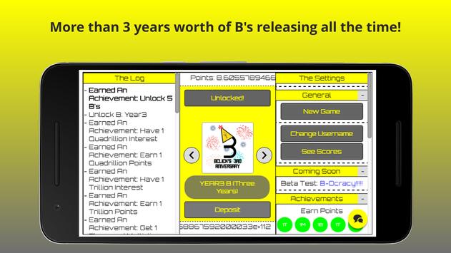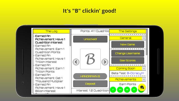 Unlock B's by purchasing them with your points. Then click the B image to get points. Is this amount not satisfying? Then unlock the next B! The second B gives you more points than the first one. So don't only click on the handrawn B, click the lowercase B. But also unlock more and get way more points like with the spiky B.
