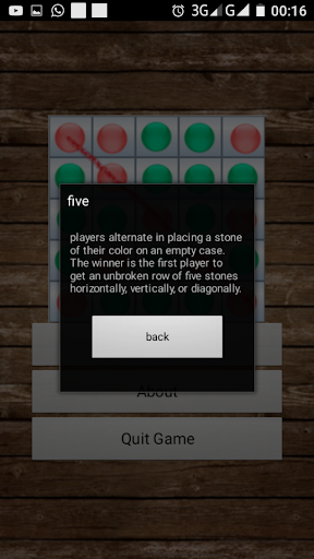 It is a board game for two players (Player vs Android) who take turns in putting black and white stones on the board. The winner is the first player to get an unbroken row of five stones horizontally, vertically, or diagonally. Overlines are not allowed (6 or plus stones doesn't count as a win)