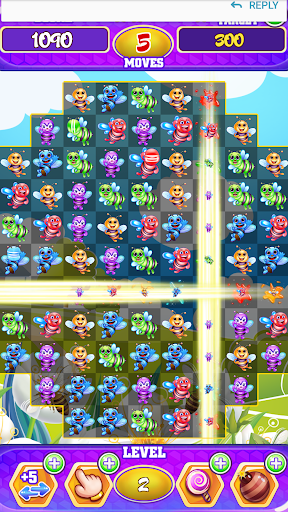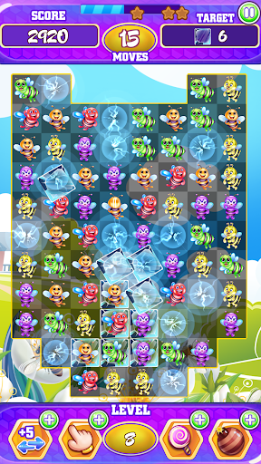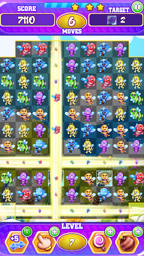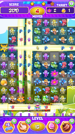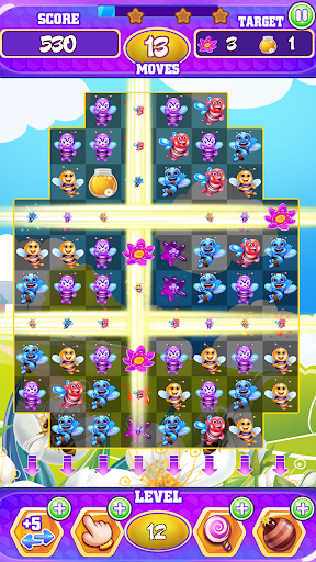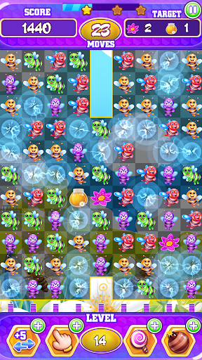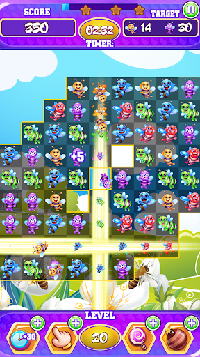 • The rules to play the game is very simple. All you have to do is achieve a target score using a certain number of moves in each level. And how can you get the score? You have to swap two adjacent tiny bees of similar type and group them in horizontal or vertical lines of three or more. The more the number of bees in one line, the better will be your score.