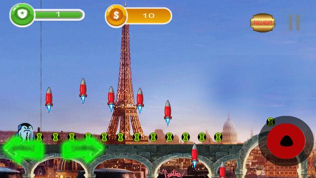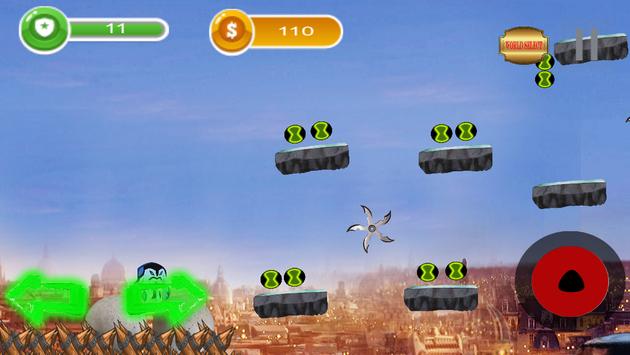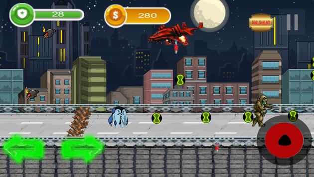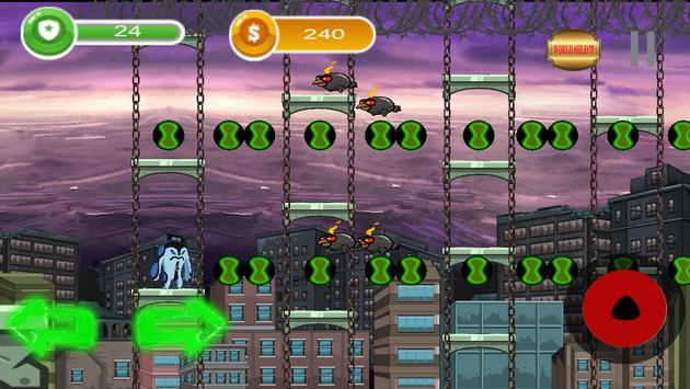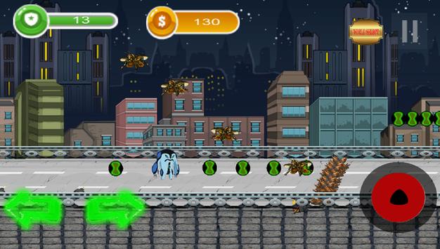 In ben jungle 10 alien fighter runner game you can move to tow direction forward and up you can also flay using his power sound sonic waves. With some speed click in the jump button to jump and passed all danger or when you face obstacle (water, alien, bee alien, steel ball, goblin galaxy...)or just attack with you ability.