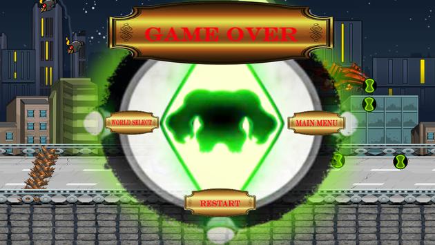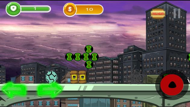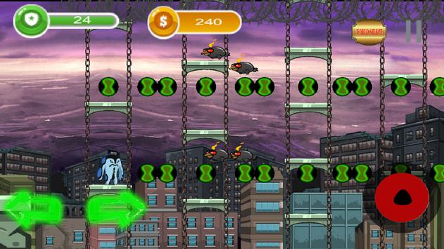 Dans ben jungle 10 jeu de coureur de combat étranger, vous pouvez vous déplacer vers la direction de remorquage vers l'avant et vers le haut, vous pouvez également écraser en utilisant ses ondes sonores de puissance. Avec un peu de vitesse, cliquez sur le bouton de sauter pour sauter et passer tout danger ou lorsque vous faites face à un obstacle (eau, alien, abeille alien, boule d'acier, goblin galaxy ...) ou simplement attaquer avec vous.
