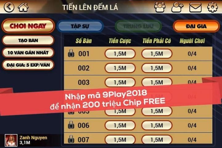 Tặng Tài khoản mới Giftcode 200tr, cách dùng: Tải Game >> Nạp Tiền >> Nhập Code "9play2018" để nhận 200 triệu Chip.