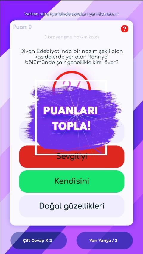 Yarışma esnasında %50 joker hakkı ve çift cevap verme hakkı bulunur. Yarışmacılar doğru cevap verdikleri taktirde 10 puan hanesine yazılır. Yarışmacılar puanları biriktirerek uygulamadaki diğer yarışmacılar arasında dereceye girmeye hak kazanır. Haftalık en fazla puanı toplayan yarışmacılar arasında ki 3 kişi ödül almaya hak kazanır.