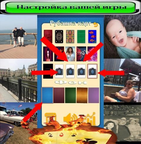 Теперь Вы можете полностью изменить внешний вид, дизайн пасьянса. Воспользуйтесь нашими опциями, своими фотографиями, рисунками или картинками и создайте нечто уникальное. Просто добавьте любое фото на рубашку карт и поменяйте цвет фона. Выбирайте любую фотографию, например Ваших друзей или любимых, и играйте вместе с ними.