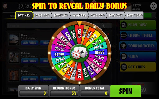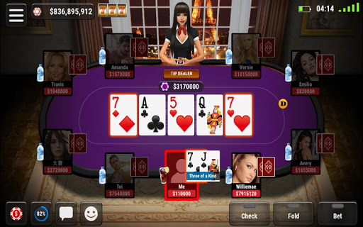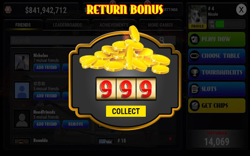 Casino games are even better with friends! Don’t get stuck playing Texas Hold’em with random players every game- Play at the same table with people you know or make new poker friends! Show them who’s poker king – invite your friends from the front page with a tap.