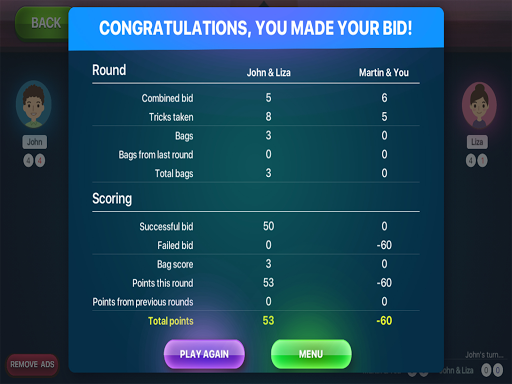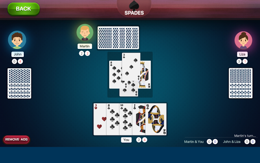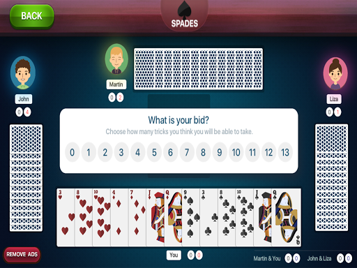 Spades Free Card Game is a really fun, free, & classic card game that you play with 4 players and 2 teams. Your partner is the one directly across from you. Each player selects how many bids they think they will get which is just how many tricks you will take (hands you win). At the end of the game whichever team makes their bids are the winners. Also there is a great scoring system so you can get stats on your matches and keep improving!