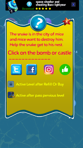 The snake is in the rat city and the mice want to kill the snake.Help the snake get to his nest.You have to defuse the bombs and destroy the castles of mice