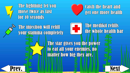 Submit your score online and try to become the number one. Challenge your friends on google or players all around the world. Can you become the best and strongest fish?