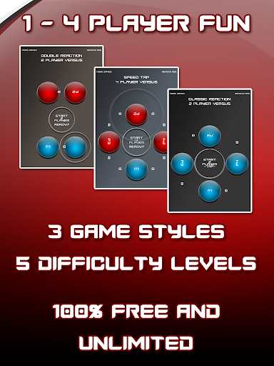 Test and optimize your reaction speed! Play alone or challenge with up to 3 Friends on one mobile device. Join the ultimate 4 Player Tap Reactor fun and join for tournaments, family fun, drinking games and reaction improvement. Download now, it's free and unlimited!