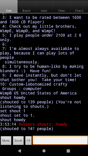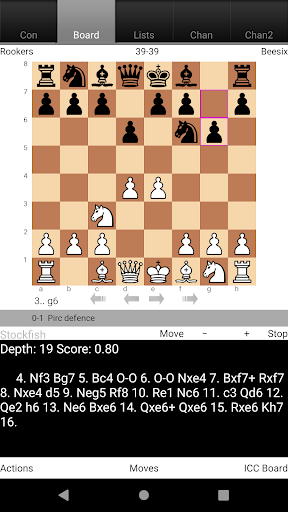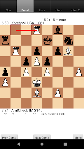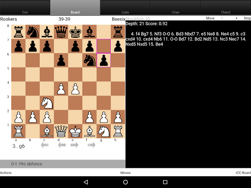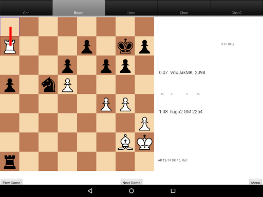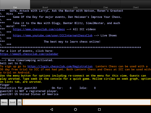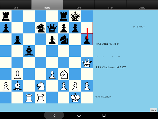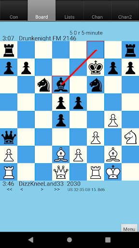 Lantern Chess on Android is an interface for playing chess, observing games, and chatting on the Internet Chess Club, chessclub.com. If no ICC account then users can login as a guest and play unrated for free. This app may be used with a 30 day trial as well. The interface includes pre-move and timestamp and observing multiple games at once.