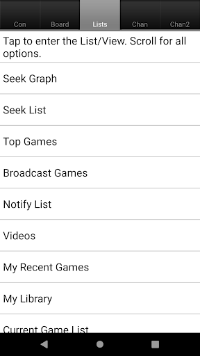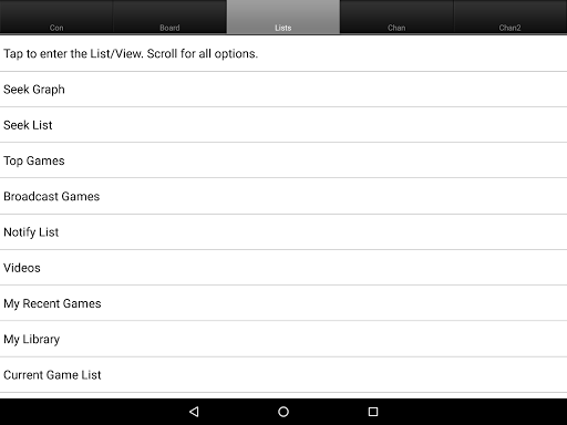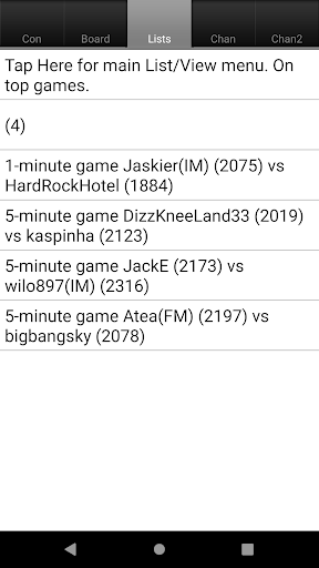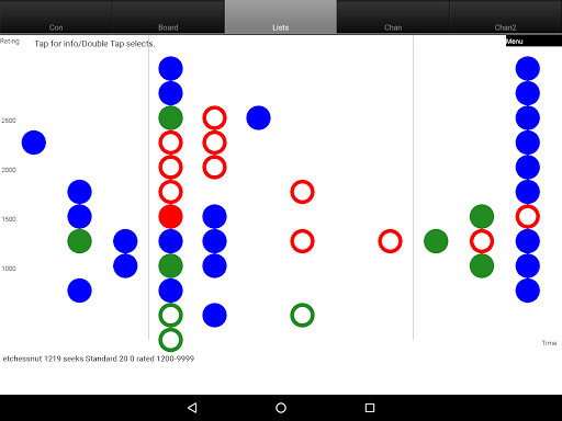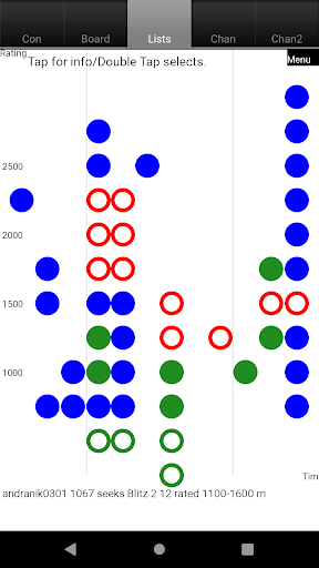 Users can go to the Lists tab and chose the seek graph or seek list to find a chess game. Hollow circles on graph are unrated and may play guests. Another option for members is going to the Board tab's menu and entering an auto pairing pool. On Lists tab there are choices to watch high rated games going on, broadcast games and current listing of ICC videos to watch as well.