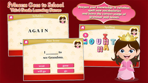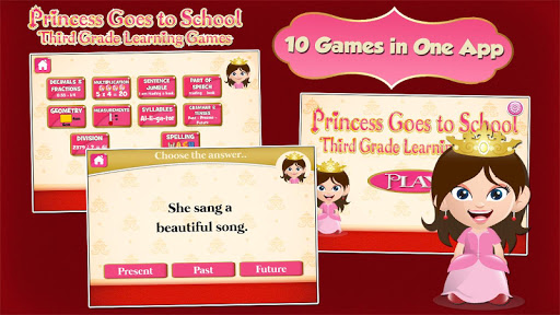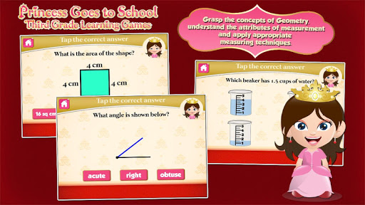 The Princess Grade 3 Games app provides third graders with an interactive educational platform to practice and perform Math and English key concepts and build up their proficiency and keep them entertained. The fun-filled English exercises highlights reading, writing and critical thinking skills through activities such as word-order, syllabication, spelling, and more. The Math drills on one hand, focuses on problem solving, making connections and decisions in real life through exercises in measurement, geometry, math operations, etc..
