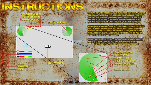 In each area you will need to obliterate the opposition so the oil and other resources can be used to help you survive. Moving across the old states of America you pick a ride, a weapon and battle to the death. Its you or them, they do not want to share.