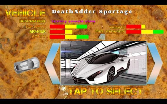 Select an unlocked level, car and weapon and eliminate all the enemy any way you can. bluetooth and other controllers are usable, or switch between onscreen joystick or buttons to control speed and movement. Tapping anywhere (or space key or fire) will shoot your weapon. Good Luck - you will need it.