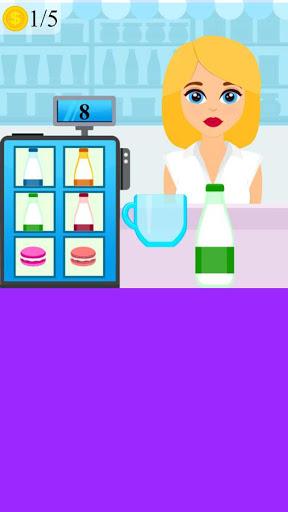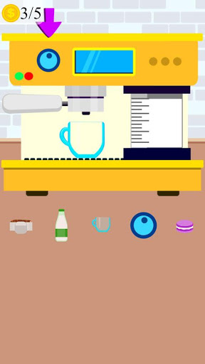 coffee machine maker game. buy in the store a cup and a cookie. make coffee with milk. fix a broken coffee machine. clean the coffee shop.
