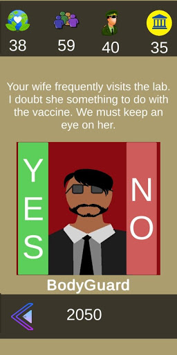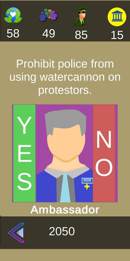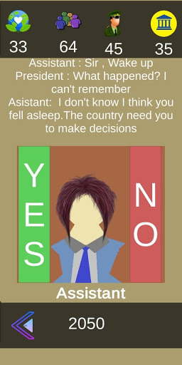 Lead an entire nation to salvation – or destruction – in a post-apocalyptic world set beyond the year 2075. With a simple swipe of your finger, left or right, you’ll be able to decide of this Nation’s destiny, taking hard decisions about different quests and problems, that will be brought to your presidential attention. Be careful though: leading has never been easy and it will be even more challenging in a similar world. Something mysterious has thrown the whole future humanity in a deep confusion, causing a continuous stream of events as wars, illness, famine. No one seems to recall what started this all, no one seems to know anything about the odd events that keeps involving the planet, no one can explain why you seem to rise every time someone tries to keep you down.
