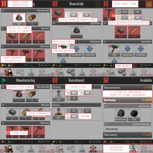 - Start from researching Harvesting/Proccesing/Crafting Wood&Stone. Craft first pickaxe, sell some stone, hire worker and set him to dig stone.