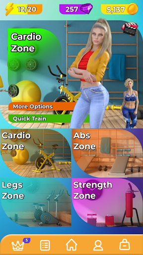 Passion Gym is divided into 4 training areas: Cardio (a sexy body needs a strong heart), Abs, Legs and Strength zone, keep an eye on the zone you are in training, as each of the sexy girls will have zones that they love or hate.