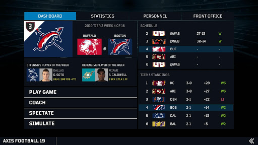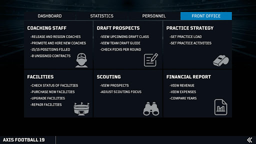 Axis Football is an 3D American football simulation featuring immersive gameplay and a deep franchise mode. Scout players, draft players, sign free agents, coach your team in-game, and play as the players.