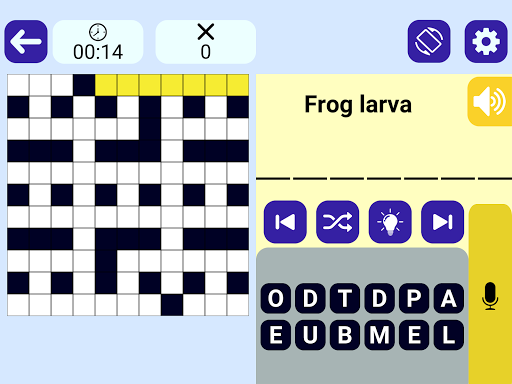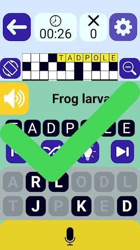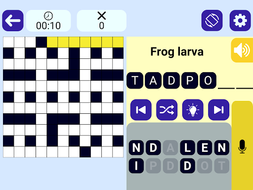 Play crossword without using any tactile action: mode suitable for blind people. The screen becomes the on/off button to activate the microphone and exchange with the vocal assistance