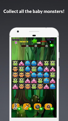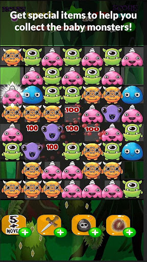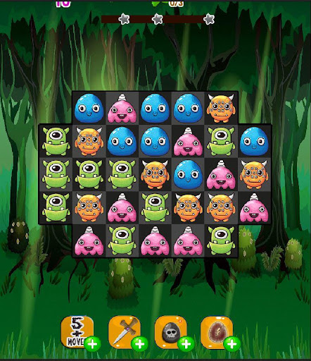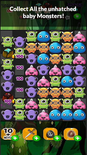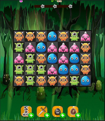 All the baby monster eggs have hatched and their moms are gone. It's your job to hunt and collect as many matching baby gummy monsters as you can, in the fewest moves possible. All to save forest from over populated with monsters. While you are hunting the baby monsters, you will clean up candy slime jam, collect unhatched eggs and feed them flies as if the flies were cookies to trick them into leaving. Hurry! Bejeweled by the all the special items to help you before time will run out which will crush your chance to collect the baby monsters and free them. Other times eggs will get frozen in ice jelly and if you make the wrong move some monsters will multiply. Jump on the opportunity to Have fun on this saga and beware of the monsters!