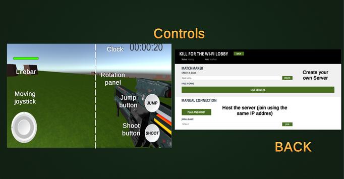 In Kill for the WI-FI, you can create servers so your friends can join it and play until there is only one survivor; on the other hand, you can host the server with your IP address, play with your friends and "Kill to be the king of your Wi-Fi". Servers allow up to 10 players.