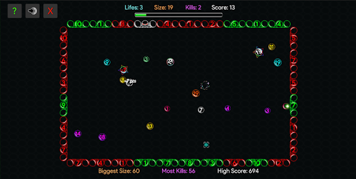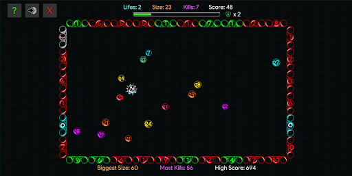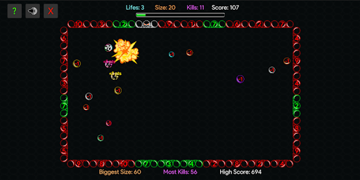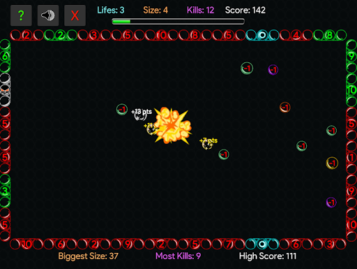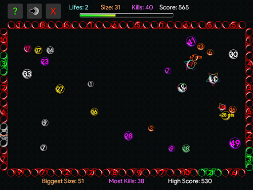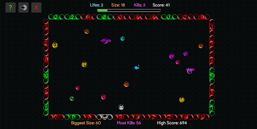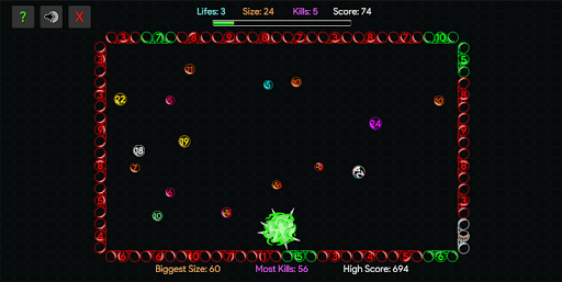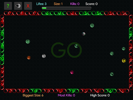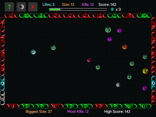The main screen of the game is presented as a rectangular border. Each side of this border divided into platforms (three bubbles next to each other) which change in color after the player makes his/her move. The top part of the screen shows the current game progress: Lifes, Size, Kills, Score and the progress bar, which shows the total sum of “enemy bubble sizes”.