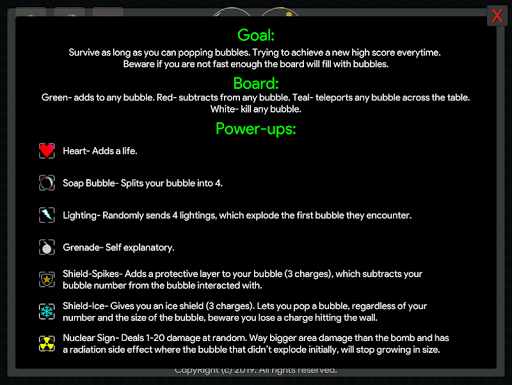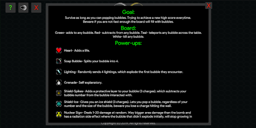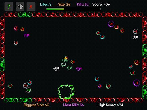 The main goal in the game is to survive as long as you can by popping (kill) bubbles. Plan out your moves and equip power-ups at the perfect time to give yourself the maximum amount of points and the highest score. Compare your progress to your best score from any game you played, and challenge your friends to see who can do better.