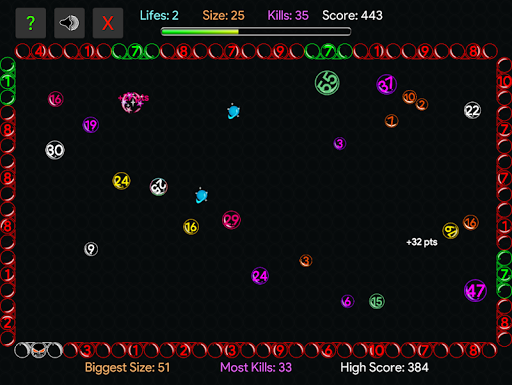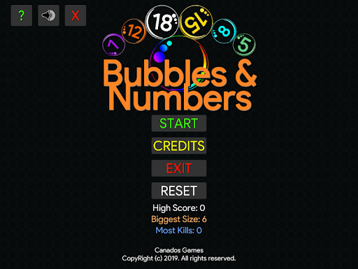 Each bubble has a number. Essentially, this number shows how much bigger the bubble compares with another bubble. The player starts and revives with the bubble size 1. If the number of the bubble gets to 0 or goes negative, the bubble pops and the player loses a life. The start position for each bubble is random.