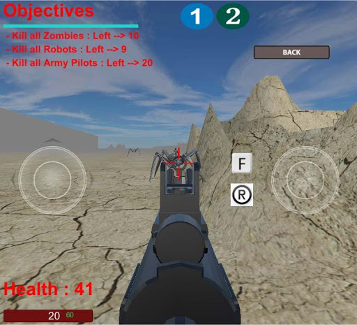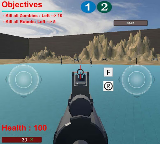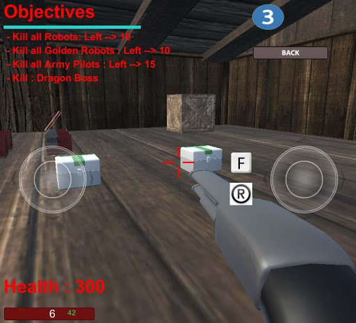 FPS - Survive is an action shooter game, where you must use your tactic to destroy all oponents... There are different objectives from level to level. It's 10 levels. When you complete level one, then you can go to level two and soo on. The oponents are different and there are bosses too. We can collect ammunitions for five different weapons and first aid kit.