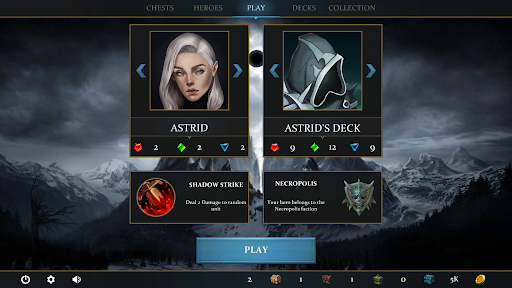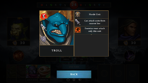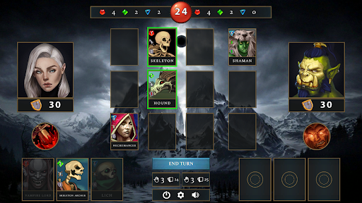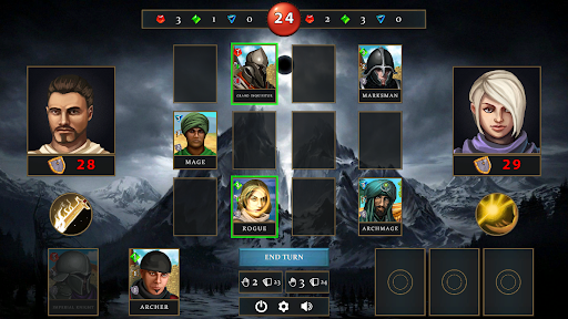 Battleground Fantasy is a fantasy collectible card game. Choose your hero from one of four fractions and fight against other champs. Heroes can unlock unavaible cards and get them from chests which hero buy by gold or win in the battles. In the battles heroes use cards from their active deck and use their unique ability. The winner of the battle is hero who dropped enemy health to zero. Heroes have three types of resources which they gain every turn and spent to use cards of concrete type of resource. Also cards can be melee or ranged type and deal damage to different enemy units. Plan your battle and situate your cards in battlefields wisely.