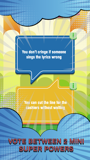 Mini Super Power is party game that you play with your friends and vote between 2 super powers to the final until you select the winner.