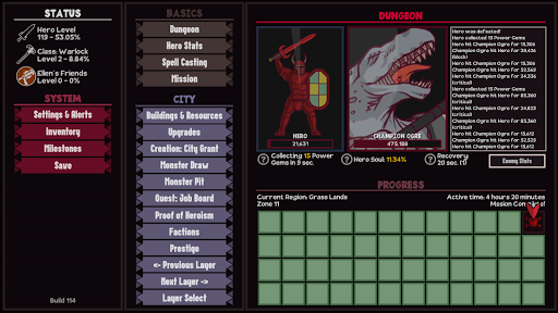 Now imagine there's 9 of those games stacked on top of each other in layers and each one has its own set of resources as well as its own prestige resource that supports the layer above it. There's also a limited set of resources you have to thoughtfully allocate between all of these layers. All the while you're aided by Hero, who's crawling through a dungeon full of monsters in search of resources to help you build up the Wilderness, the Village, the City, and what lies beyond...
