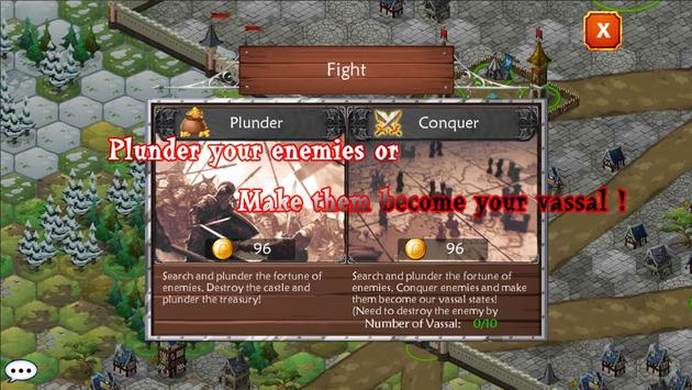 *Completely conquer other players can let them become your vassal states. You can get support from their armies during the battles with others. Keep an eye on the relationships with them. Too much pressure will make them escape away. You can give them some resources as gifts to improve