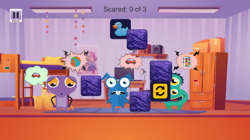 In the funny card game Scare Monsters: An Addicting Memory Card Game for Kids, you have to protect sleeping children from the monsters that live in their rooms. Monsters wake up in some houses when the children are asleep and cannot scare away the monsters. Monsters are afraid when children have fun playing with their toys and cards. Different monsters live in different houses. There are funny, sad, scary, slow, etc. monsters. But every monster is afraid of this or that toy in the child's room.