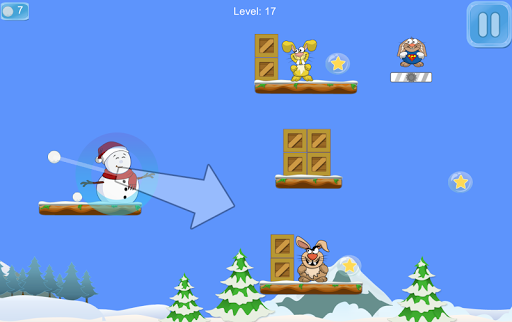 Gameplay is just touch and drag your finger on screen to release the shot. You will see helper points around the snowman puffy. Shot snow balls to bunnies to drop them down. Just funny rabbits around the snow man like shooting ball games. some devices support mouse events can makes possible to play game on android-tv or joystick controlled tablet.