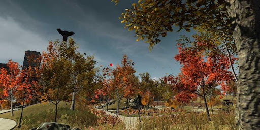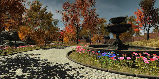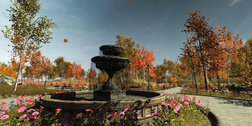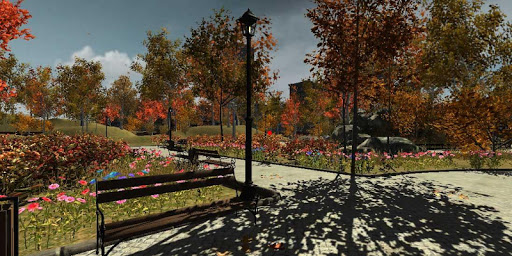 Sunny day and relax in park. Big city with pedestrians and cars.