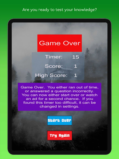 A limited amount of time is given to answer each question, to add challenge and excitement to the game. This timer can be adjusted in the settings menu.
