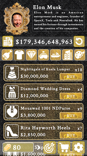 In this utterly zany management game, you're about to dive headfirst into the financial worlds of your favorite billionaires. Do you think you could spend Elon Musk's money faster than he can launch a rocket into space? Can you outspend Jeff Bezos by purchasing items online? This is your chance to find out, all while having the time of your life!