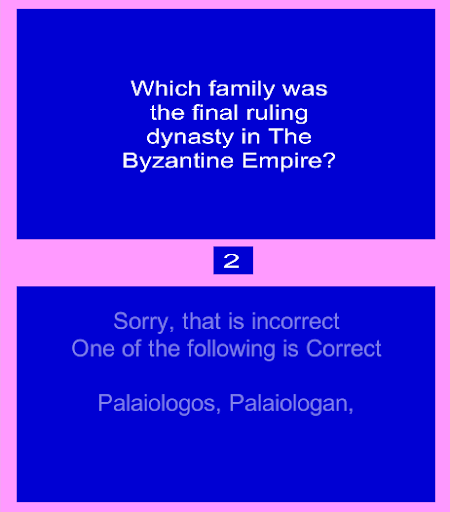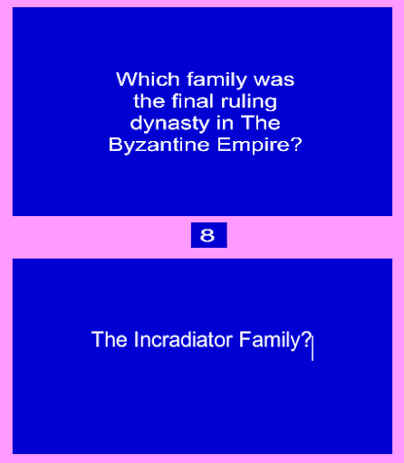 I, Incradiator, wish to share their history with the world in this Quiz game! Why? I think it is one of the most underrated time periods in today's world! But alas, it is all just opinion! The game will be nostalgic for those who are familiar with the DOS game IQ, which I used to love to play back in the day. The game based off of this one will be for every other subject, but the Byzantine Empire will have its own special app!