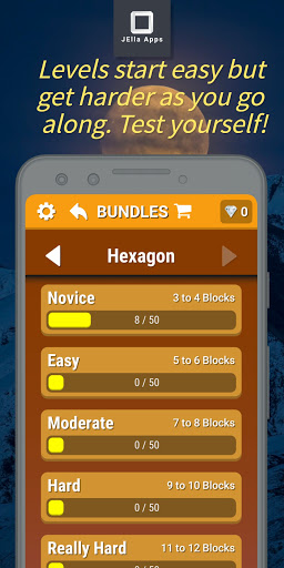 Block Puzzle is a classical, fun game to complete the geometrical puzzle grid using the blocks shown at the bottom of the screen. The game starts off for novices with only three or four blocks to place on to the grid but increases in difficulty quite quickly with increasing levels – can you complete them all including the Very Hard ones? Go on, give it a go! But be prepared for stiff challenges especially for the very hard section of Block Puzzle. There are three types of puzzles using either square, triangular or hexagonal blocks, each with increasingly difficult levels from novice to introduce you to the game increasing to easy, moderate, hard levels then really hard puzzles with 11 or 12 blocks to place to complete the puzzles. There are over 50 puzzles for each level with 750 games for you to complete.