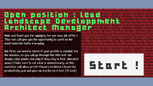 In this game you'll play as an applier for the role of Lead Landscape Developpment Architect Manager. You'll be tested on your skill : use your finger to cut down unnecessary leaves, and try to get the requested number of flowers. The more leaves there is, the more flowers will grow ! But you should be careful : if too many leaves grow outside the allocated area, be prepared to start all over again.