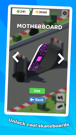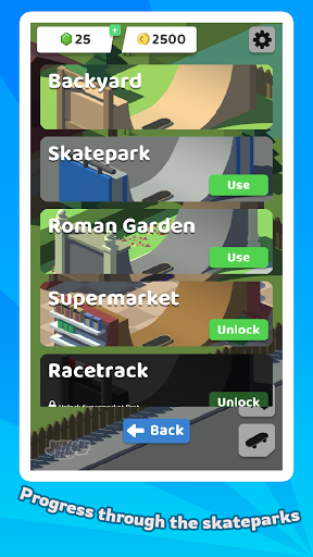 Begin in your backyard on your own build skate ramp and an old skateboard 🛠️. Do awesome tricks and unlock a new skateboard. Progress your way though each skatepark.