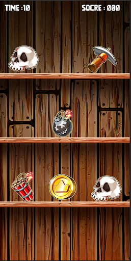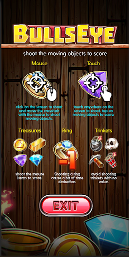 Bulls Eye is a simple shooting game, shoot all diamond, cup, gem, coin, and gold bar. But don't shoot the ring, bomb, pickaxe, Dynomite, and Skulls. because it reduces your points.