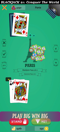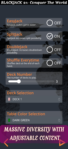 Moreover, Blackjack 21 Campaign: Conquer the World is a fully customizable Blackjack game! Select cards from 28 different decks and customize your casino table color. There are more than 200 deck/table combinations in Blackjack 21 Campaign: Conquer the World. Customize your game screen and enhance the fun!