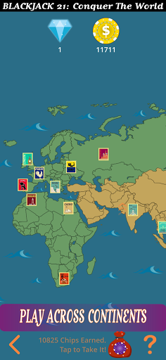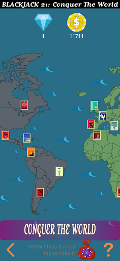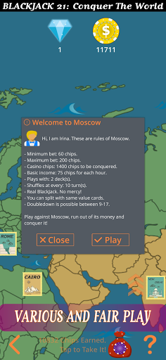 Try your luck in Sydney, fly for the Mighty Casinos of Asia, land of passion. Use your skills to conquer Bangkok, Macau, New Delhi and Moscow. If you are lucky and skillful enough, you can even play in European Casinos. Use your Blackjack skills in Kiev, London, Paris, Rome and Madrid. You will need more and more luck for African casinos. From Madrid, pass through Gibraltar Canal and play Blackjack in Casablanca Will you be able to conquer brave and lucky lands of Cairo and Cape Town? Fly over the Great Ocean and see if your Blackjack Skills are enough for playing in hardest Casinos in South America! Expand your Blackjack empire over Buenos Aires, Rio and Caracas! Rule your casinos, upgrade them and increase your income. Havana, New Mexico and Vancouver will be ready for your Blackjack Skills! Maybe, if you are a real Blackjack player, you can even reach the Legendary Las Vegas! Conquer all 21 casinos, which are all having different Blackjack types and rules. Let the world see who is the greatest Blackjack player in the world!