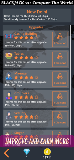 Your adventure will start in a small Blackjack Casino in Melbourne, Australia. Use your money to Upgrade your Casino. Upgrade your Casino's building, tables, managers, croupiers, security and singers. Boost up your income! This small casino will provide you some chips to be spent in following Casinos.