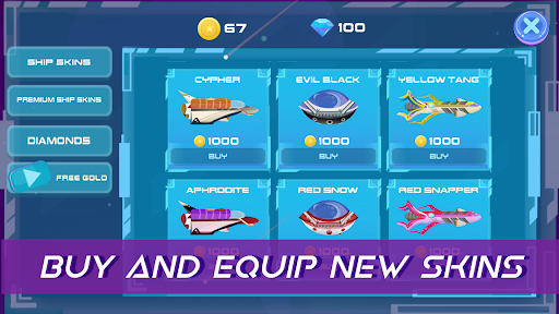 Spend your gold coins to unlock and collect different ship customizations. You can also buy diamonds to buy some premium ship skins with cool ship appearances and shooting effects. Collect gold coins from watching ads in the shop or collect them from missions and space drops from your space exploration.